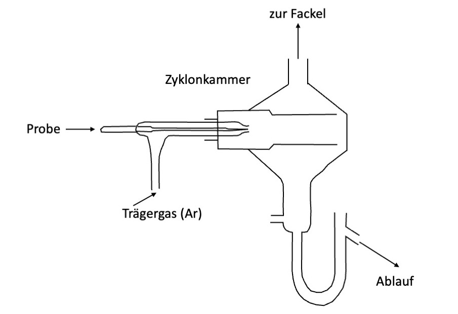 Wenn zu viel Probenaerosol in das Plasma eingebracht wird, wird es gelöscht. Denn die bereitgestellte Energie reicht nicht aus, um den beschriebenen Prozess von der Trocknung bis zur Anregung aufrechtzuerhalten. Die richtige Zufuhr der Probe für eine optimale Empfindlichkeit des Messsignals ohne Destabilisierung des Plasmas die Aufgabe des Probeneinführungssystems.